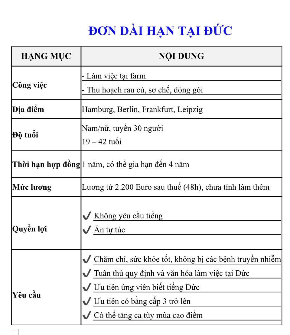 2. CHLB ĐỨC: Tuyển nam/nữ làm việc thời vụ và dài hạn tại Đức tuổi từ 20 – 45