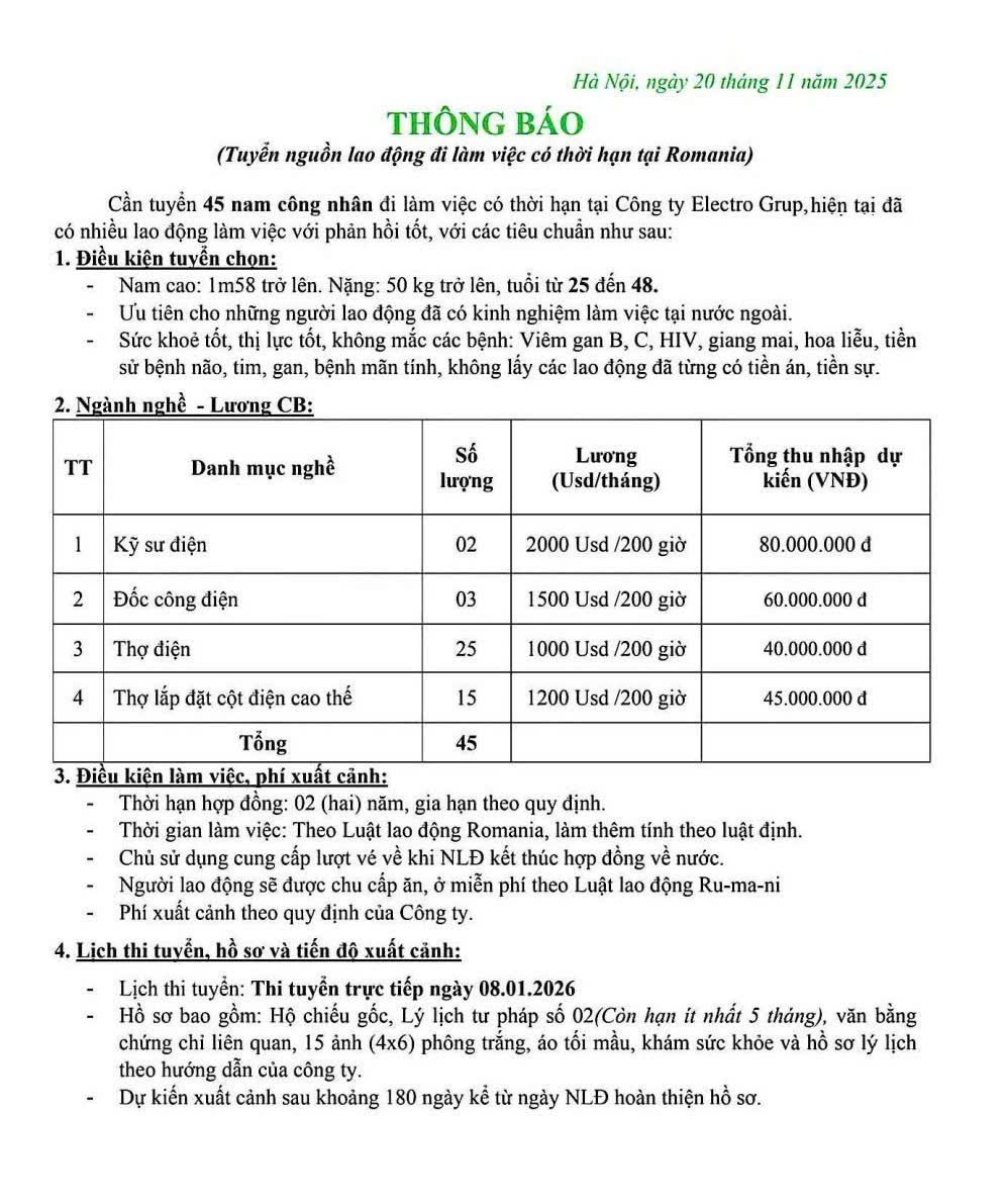 III. Thi trường Rumani: Rất nhiều đơn hàng cơ khí, xây dựng, thợ điện, nông nghiệp, thực phẩm đang cần nhận hồ sơ đăng ký ngay dịp đầu năm mới 2026.